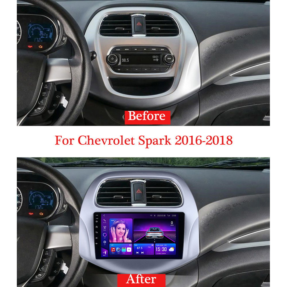 Android stereo for Chevrolet Spark 2016–2018 featuring 8-core CPU, 12+512GB, 9–13.1″ display, Wireless CarPlay, Android Auto, and plug-and-play design.