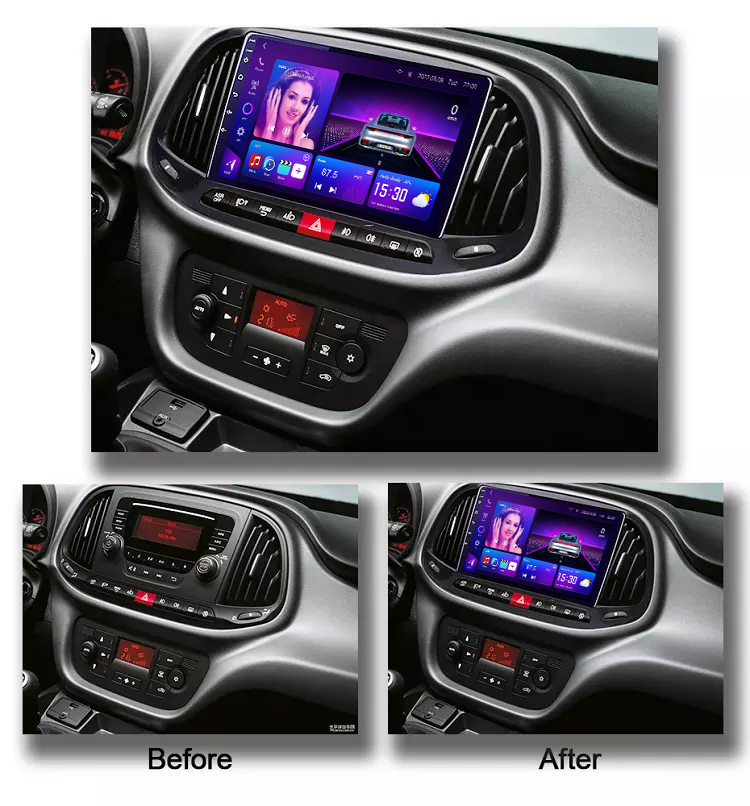 Fiat Doblo Android Radio (2015–2019), featuring CarPlay, Android Auto, GPS, Bluetooth, and DSP audio. Plug-and-play stereo. Supports multiple screen sizes for upgrade.