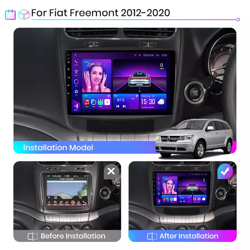 Fiat Freemont Android Radio (2012–2020), featuring CarPlay, Android Auto, GPS, Bluetooth, and DSP audio. Plug-and-play stereo. Supports multiple screen sizes.