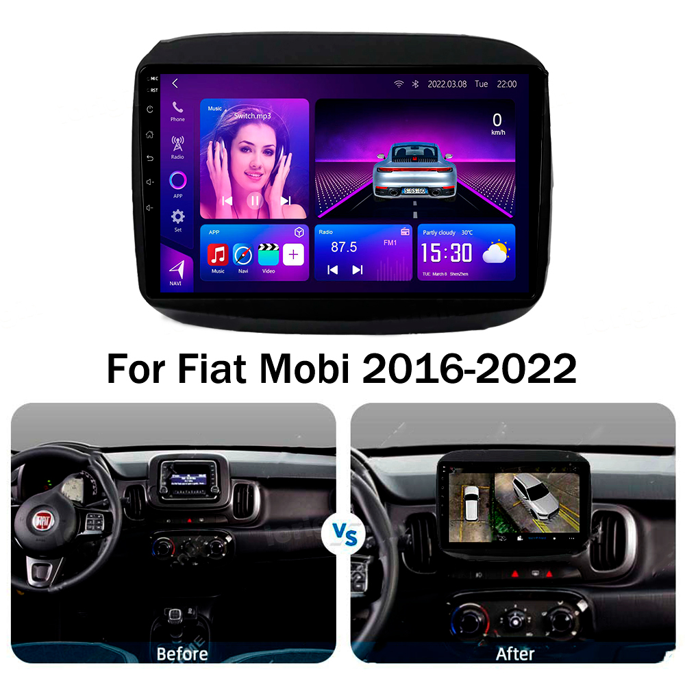 Fiat Mobi Android Radio (2016–2022), featuring CarPlay, Android Auto, GPS, Bluetooth, and DSP audio. Plug-and-play stereo. Supports multiple screen sizes easily.