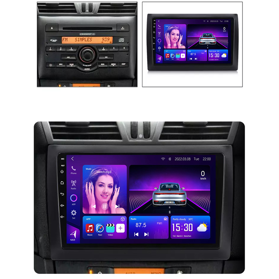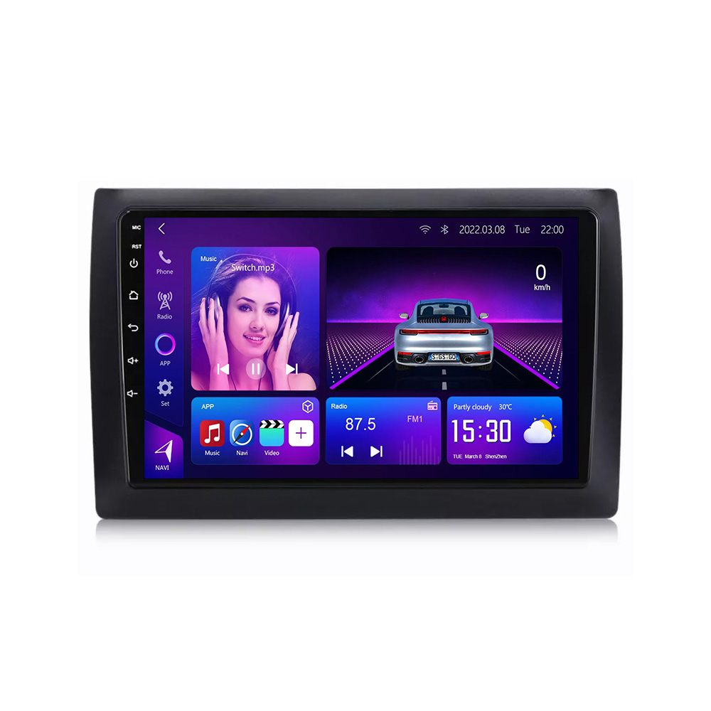 Fiat Stilo Car Stereo (2010), featuring CarPlay, Android Auto, GPS, Bluetooth, and DSP audio. Plug-and-play stereo. Supports multiple screen sizes for upgrade.