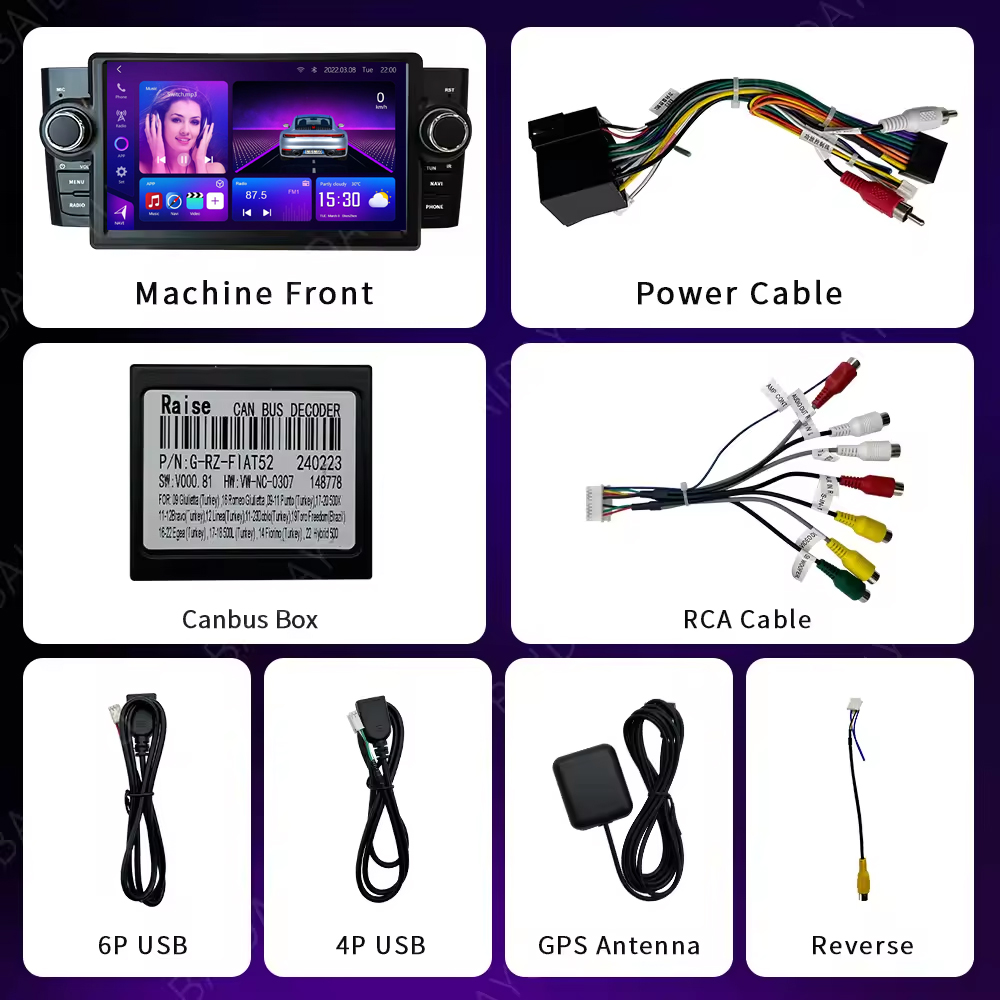 Each order includes the main device, vehicle-specific harness (no extra charge), power cable, USB lines, and installation guide. GPS antenna and accessories are included where applicable.