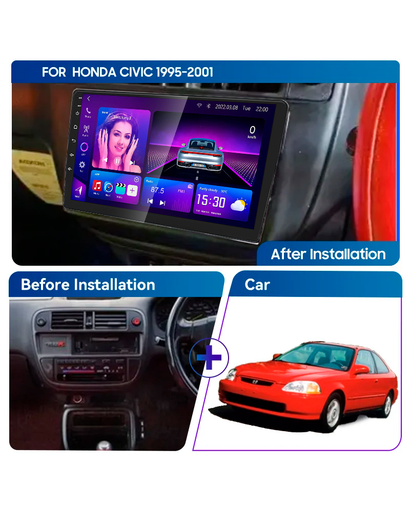 Honda Civic Car Stereo 1995–2001 with 8-Core CPU, 12+512GB, Wireless CarPlay & Android Auto, stable cooling, and plug-and-play installation.