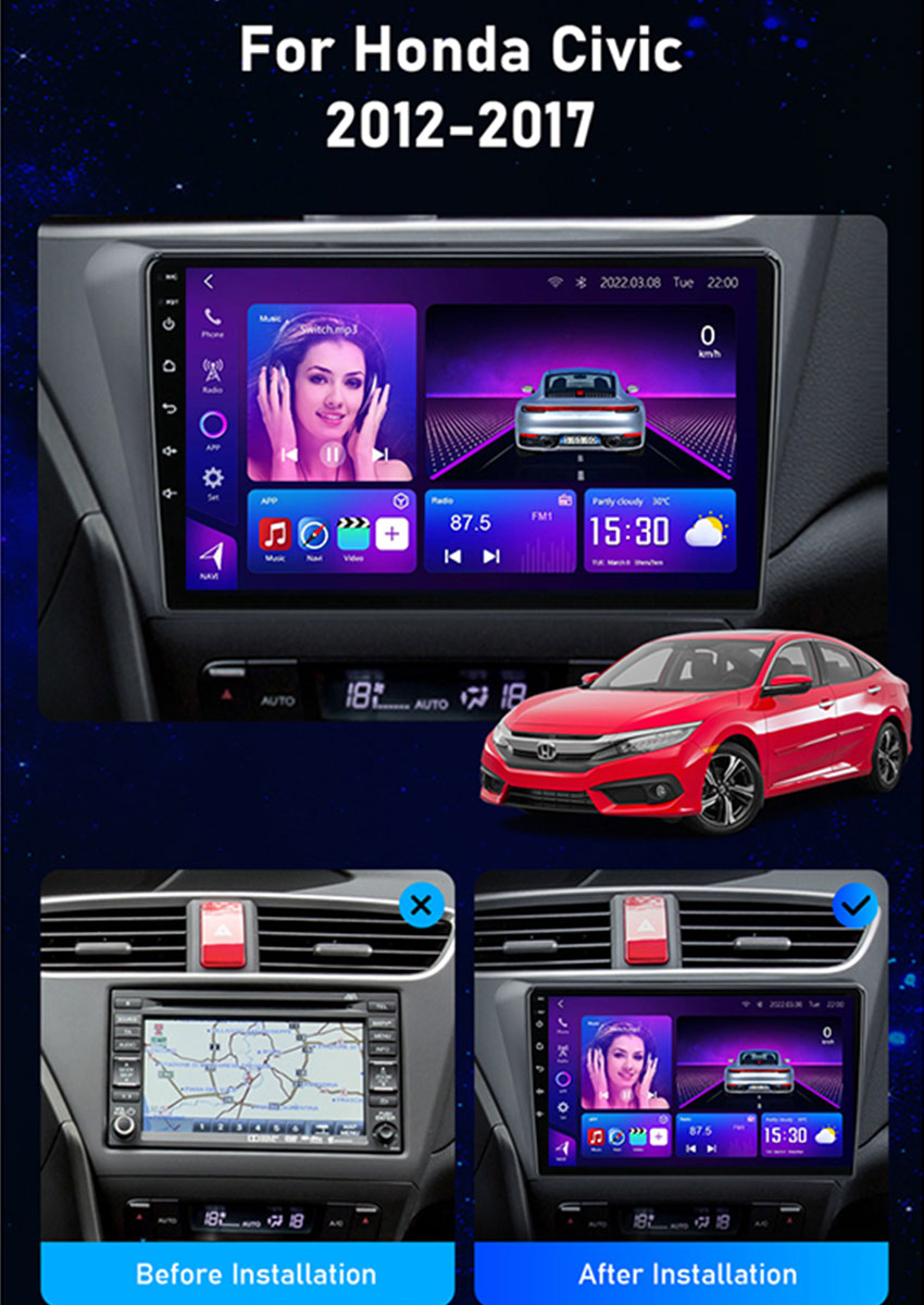 Honda Civic Hatchback Car Stereo 2013–2016 with 8-Core CPU, 12+512GB, Wireless CarPlay & Android Auto, stable cooling, and plug-and-play installation.