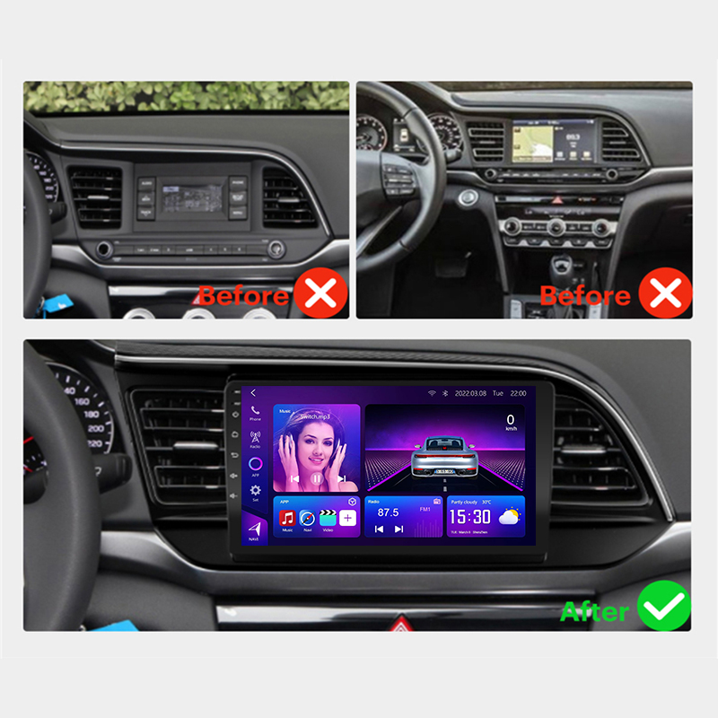 Hyundai Elantra 6th Gen Android Stereo 2019–2022, 8-Core CPU, 9” screen, Wireless CarPlay & Android Auto, DSP audio, and heat-dissipation design.