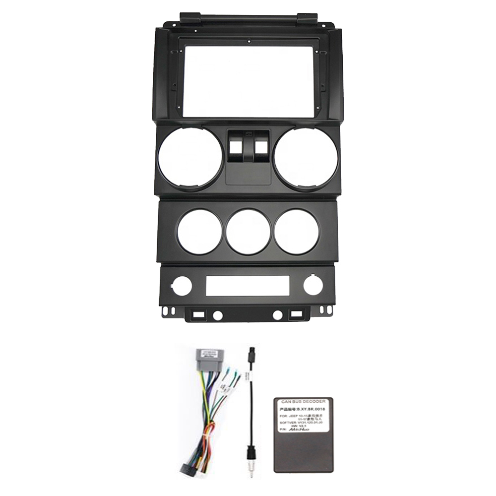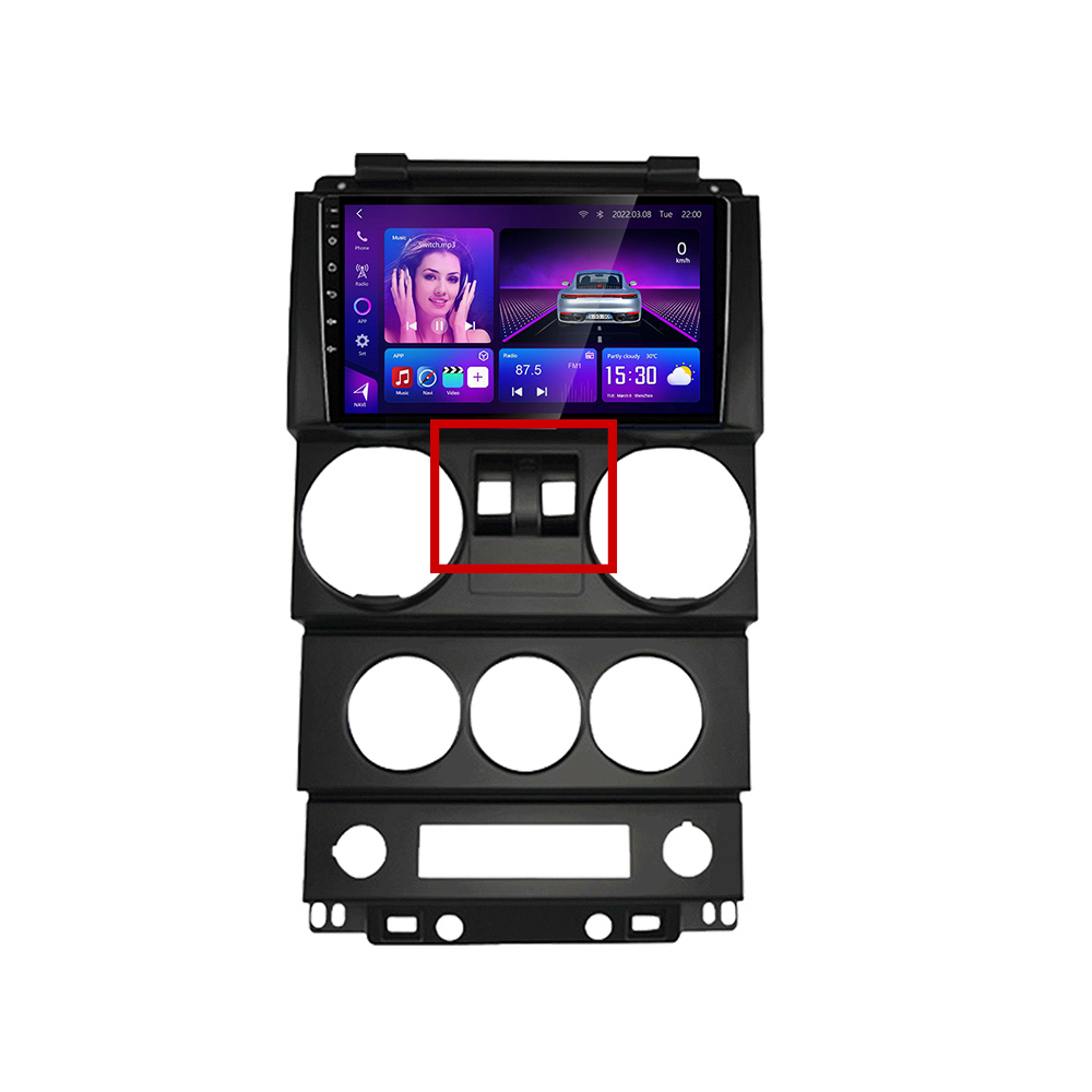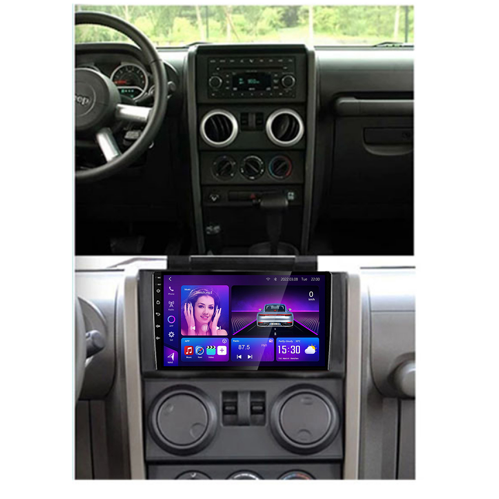 Jeep Wrangler Android Car Radio (2008–2010), featuring CarPlay, Android Auto, GPS, Bluetooth, and DSP audio. Plug-and-play stereo. Supports multiple screen sizes for upgrade.