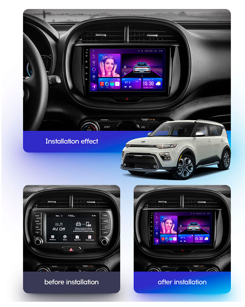 Kia Soul Car Stereo 2019–2020 with 8-Core CPU, 12+512GB, Wireless CarPlay & Android Auto, stable cooling, and plug-and-play installation.