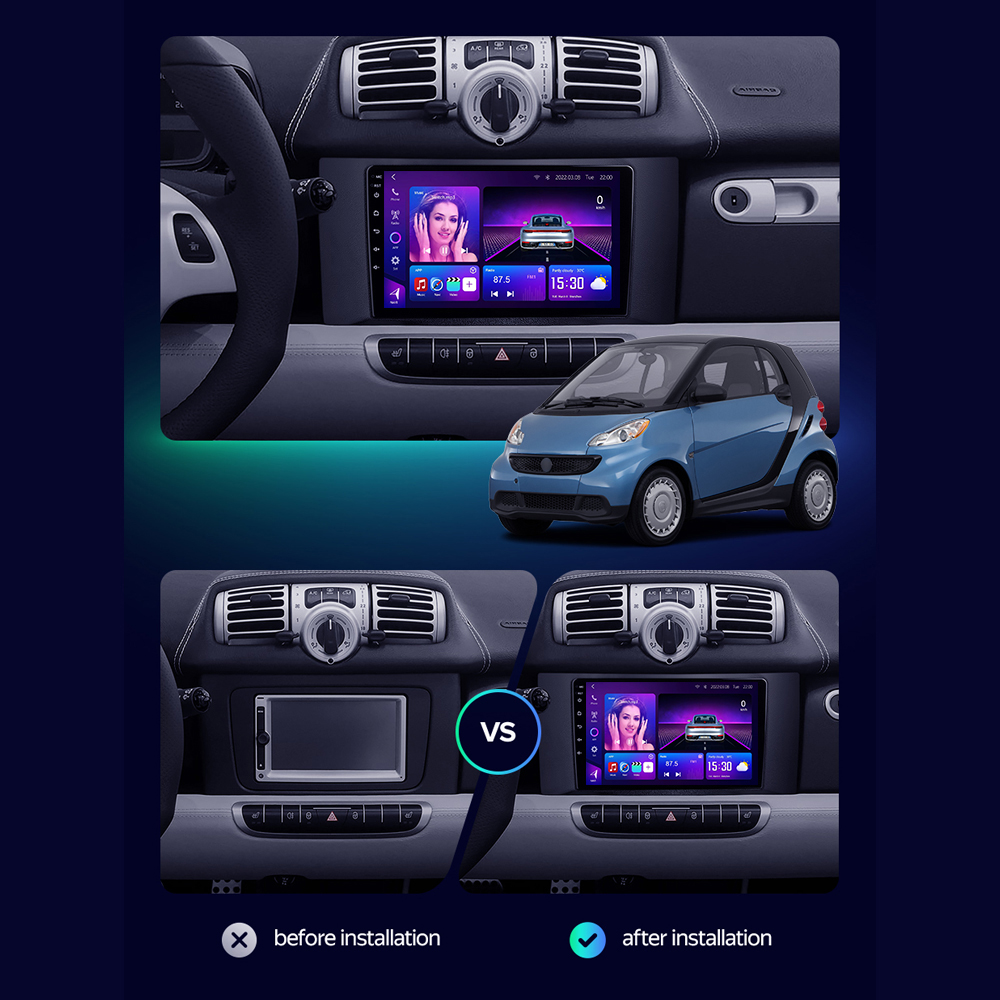 Smart Fortwo 2 Car Stereo 2010–2015 with 8-core CPU and 12+512GB; supports 9–13.1″ screens; Wireless CarPlay/Android Auto; DSP audio; plug-and-play wiring; dual-fan cooling.