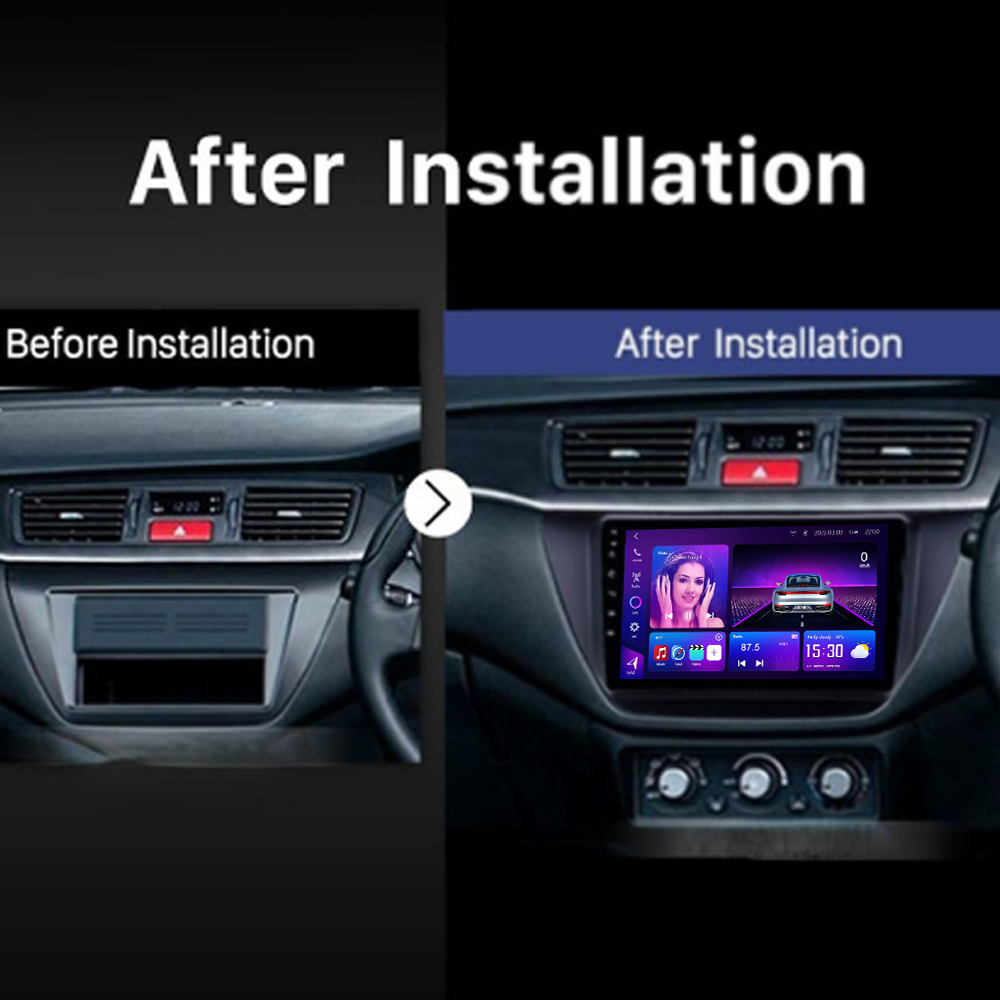 Mitsubishi Lancer Android Car Stereo 2006–2010 with 8-core CPU, 12+512GB, cooling fan, Wireless CarPlay, Android Auto, and multiple screen size support.