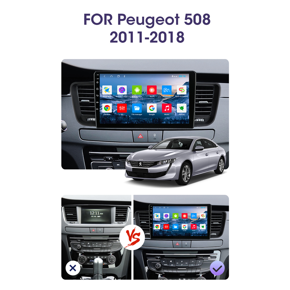 Peugeot 508 Car Stereo 2011–2018 with 8-core CPU, 12+512GB, supports 9–13.1” screens, Wireless CarPlay & Android Auto, plug-and-play, cooling fan.