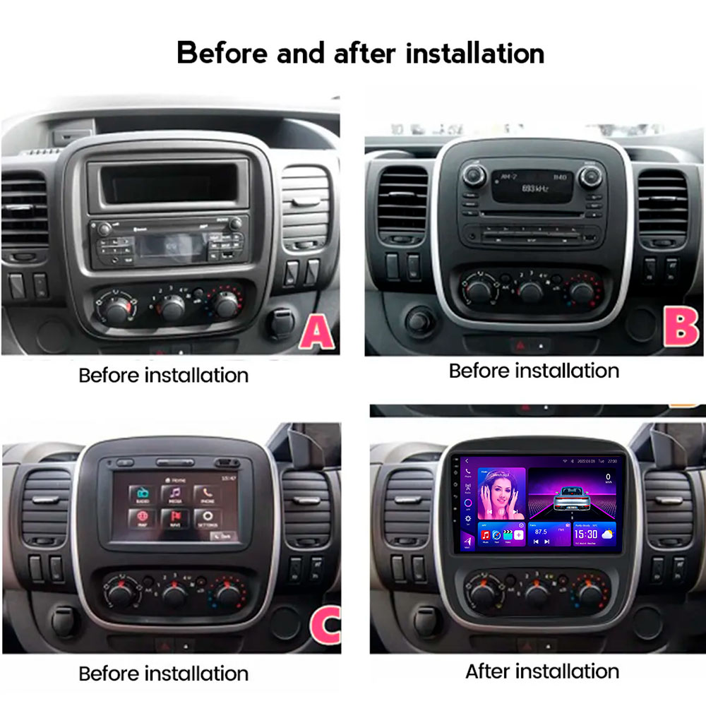 Custom-fit Android car frame for Renault Trafic 3 2014-2021. Easy installation, OEM dashboard fascia for multimedia, navigation, or stereo head unit upgrade.