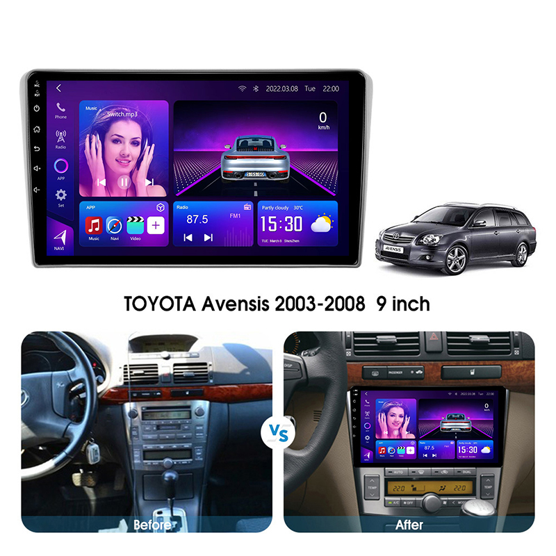 Toyota Avensis T25 Car Stereo 2003–2008 with 8-Core CPU, 12+512GB, DSP, wireless CarPlay & Android Auto. Plug-and-play for T25 trims.