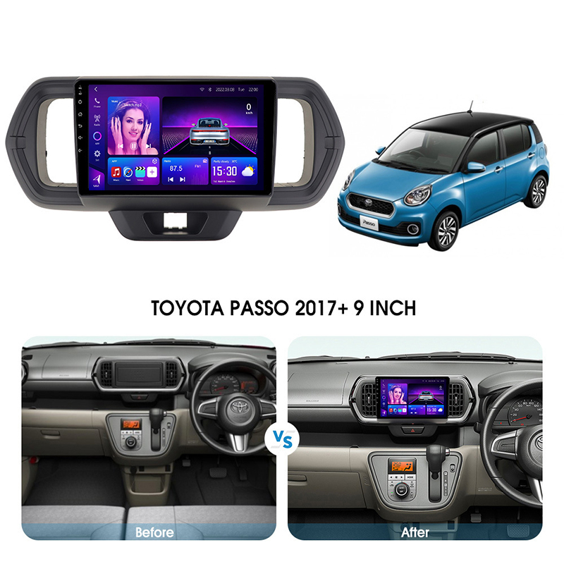 Toyota Passo Car Stereo 2016–2021 upgrade with 8-core CPU, 12+512GB, Wireless CarPlay, Android Auto, cooling fan, and support for 9–13.3 inch screens.
